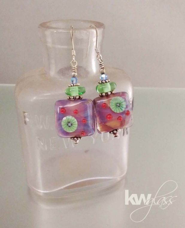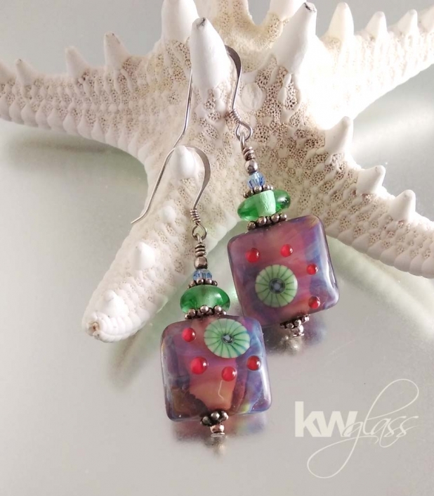 Sterling Silver earrings with silver glass that gives them whisps of blues, pinks and purples. Then some added accents of blue, green & red.