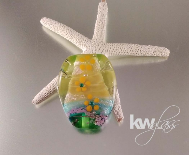 This focal bead will add color and cheer to any jewelry piece. It is a lime green base complimented with blues, teals and purple with a fun floral embellishment of many colors.